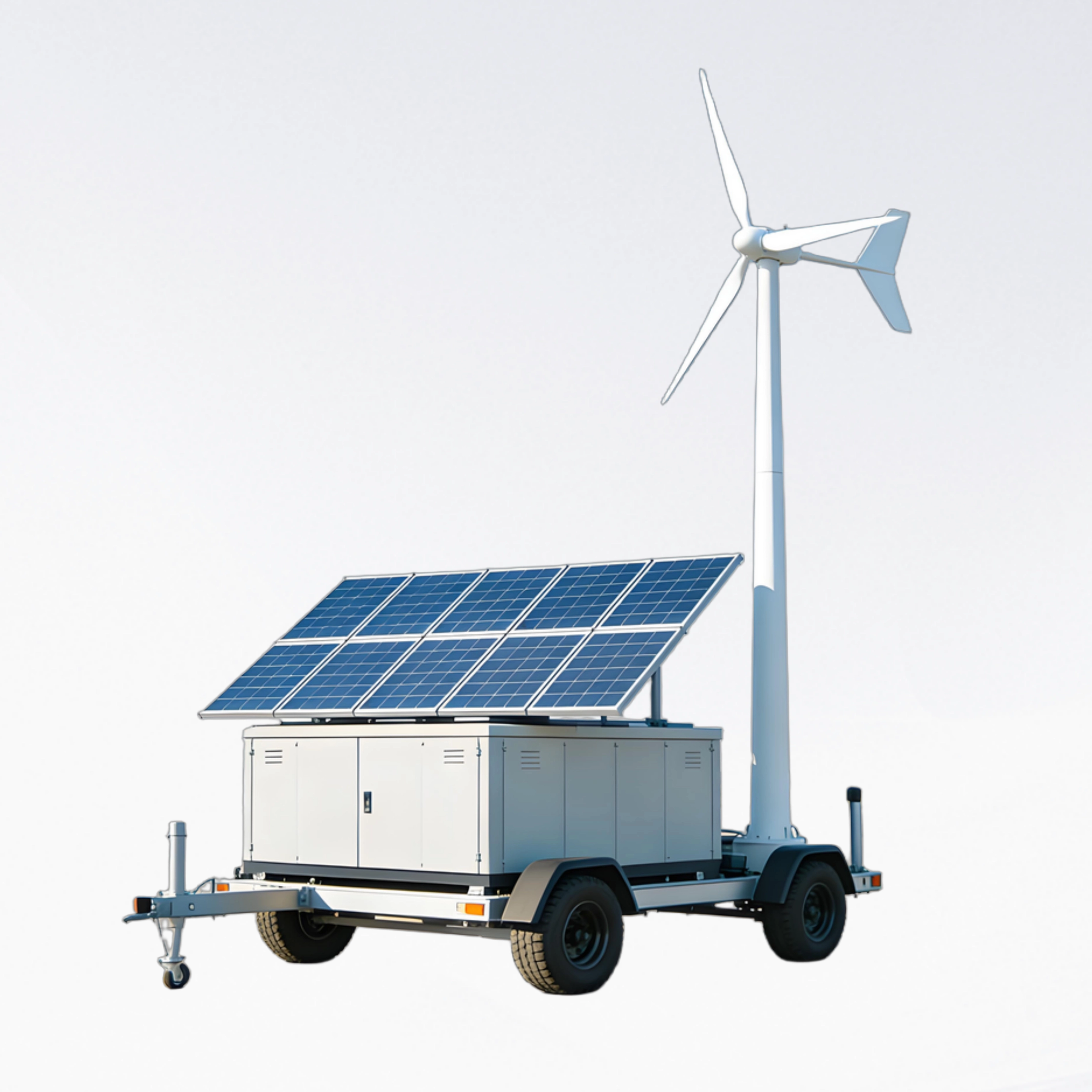 Tragbarer Anhänger und schneller Einsatz : Integrierte Anhängerstruktur mit schwellenfreier Installation, leicht von gewöhnlichen SUVs und Pickups gezogen, anpassbar an unbefestigte Straßen wie Grasland und Berge. Die einstellbare Turmhöhe optimiert die Effizienz der Stromerzeugung je nach Wind- und Lichtverhältnissen vor Ort und ermöglicht eine schnelle Inbetriebnahme bei der Ankunft.